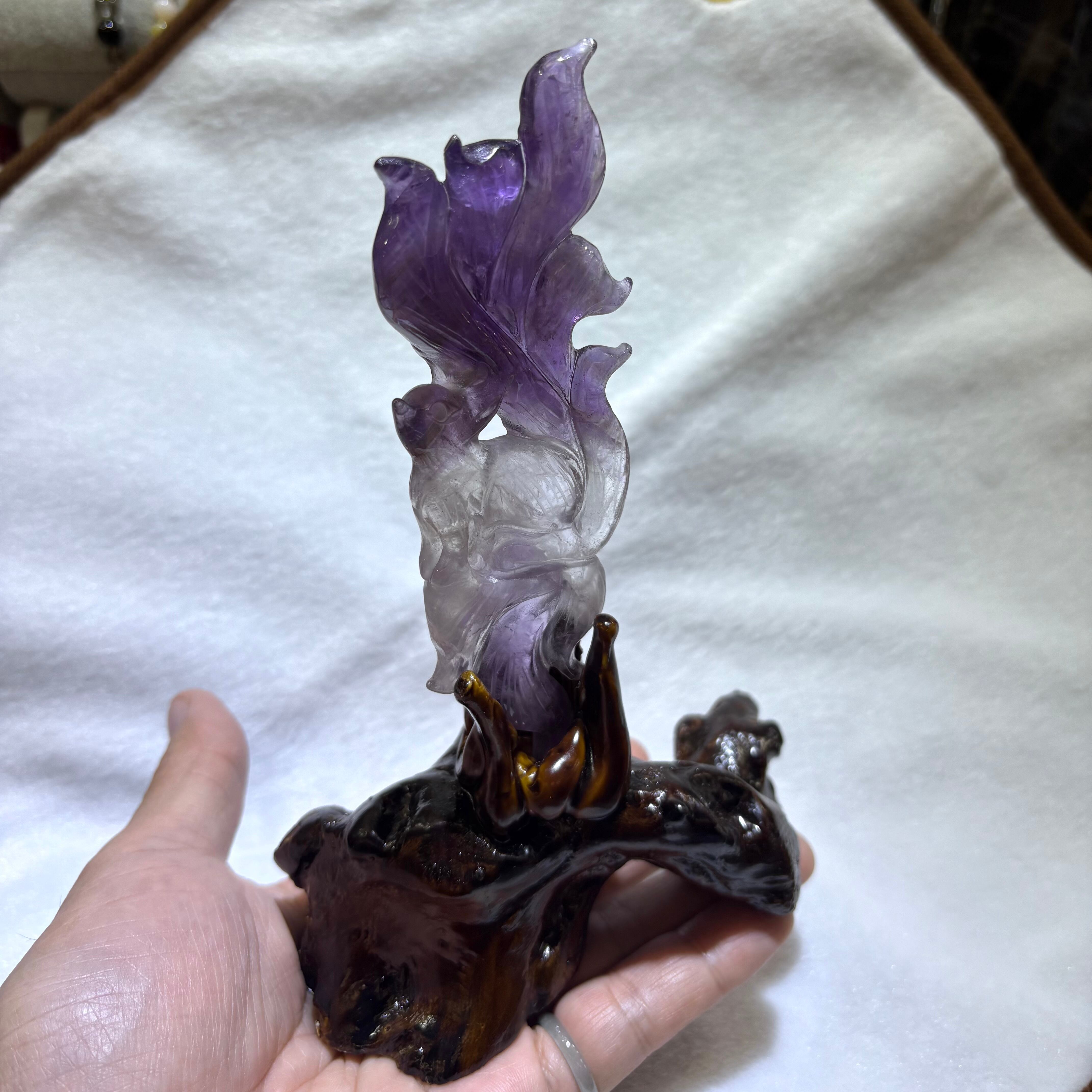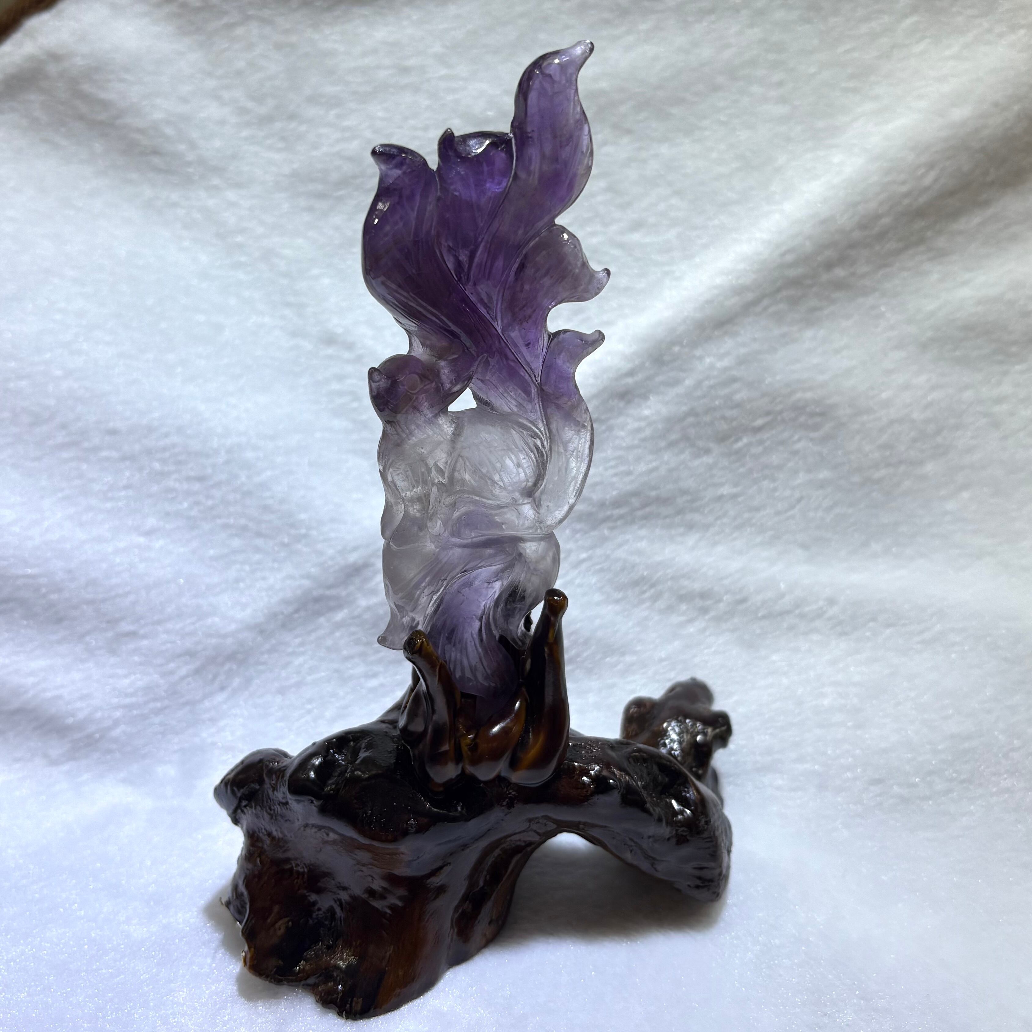 アメジスト彫刻 九尾の狐 置物 — 木製台座付き — — 紫の輝きが舞う、優美なフォルム —