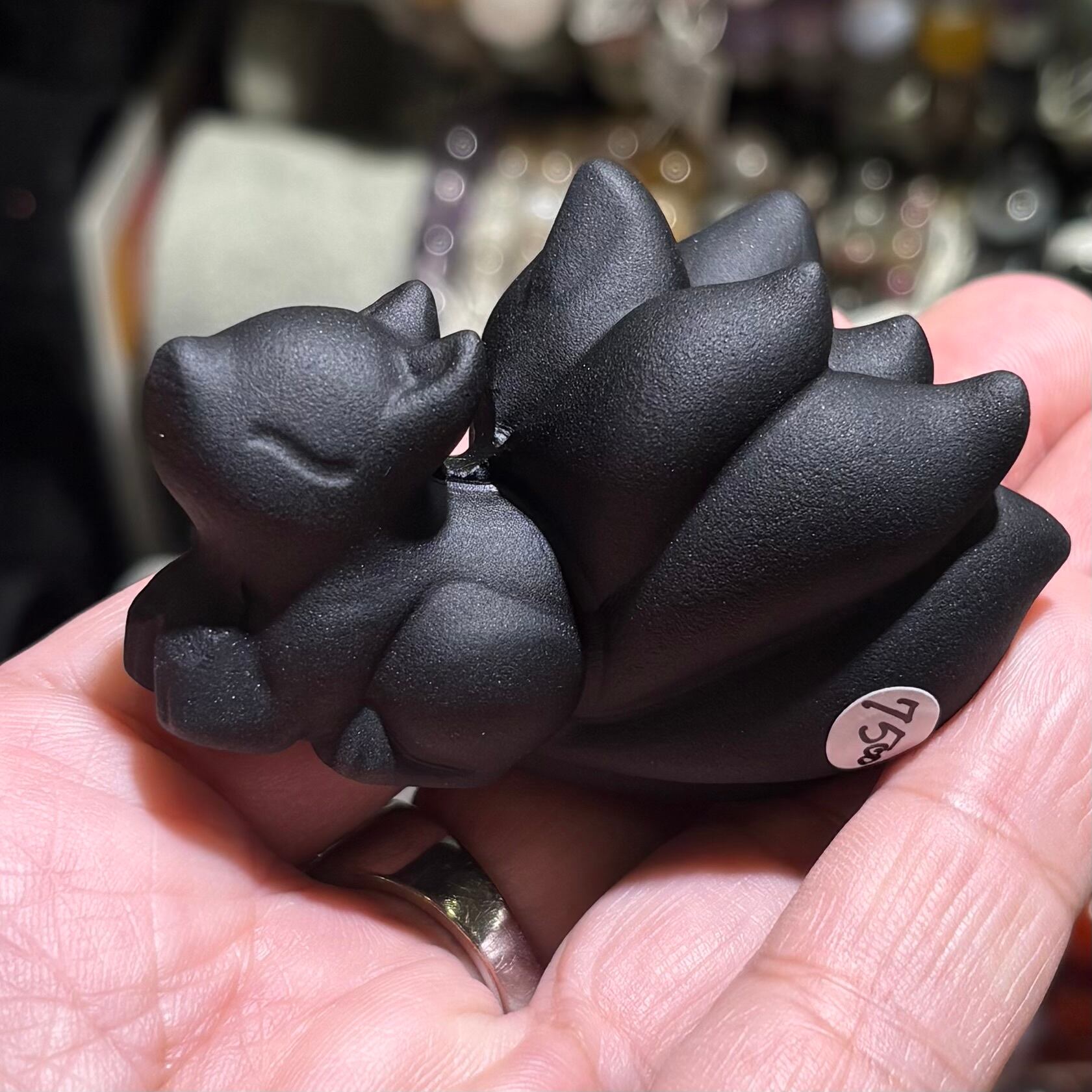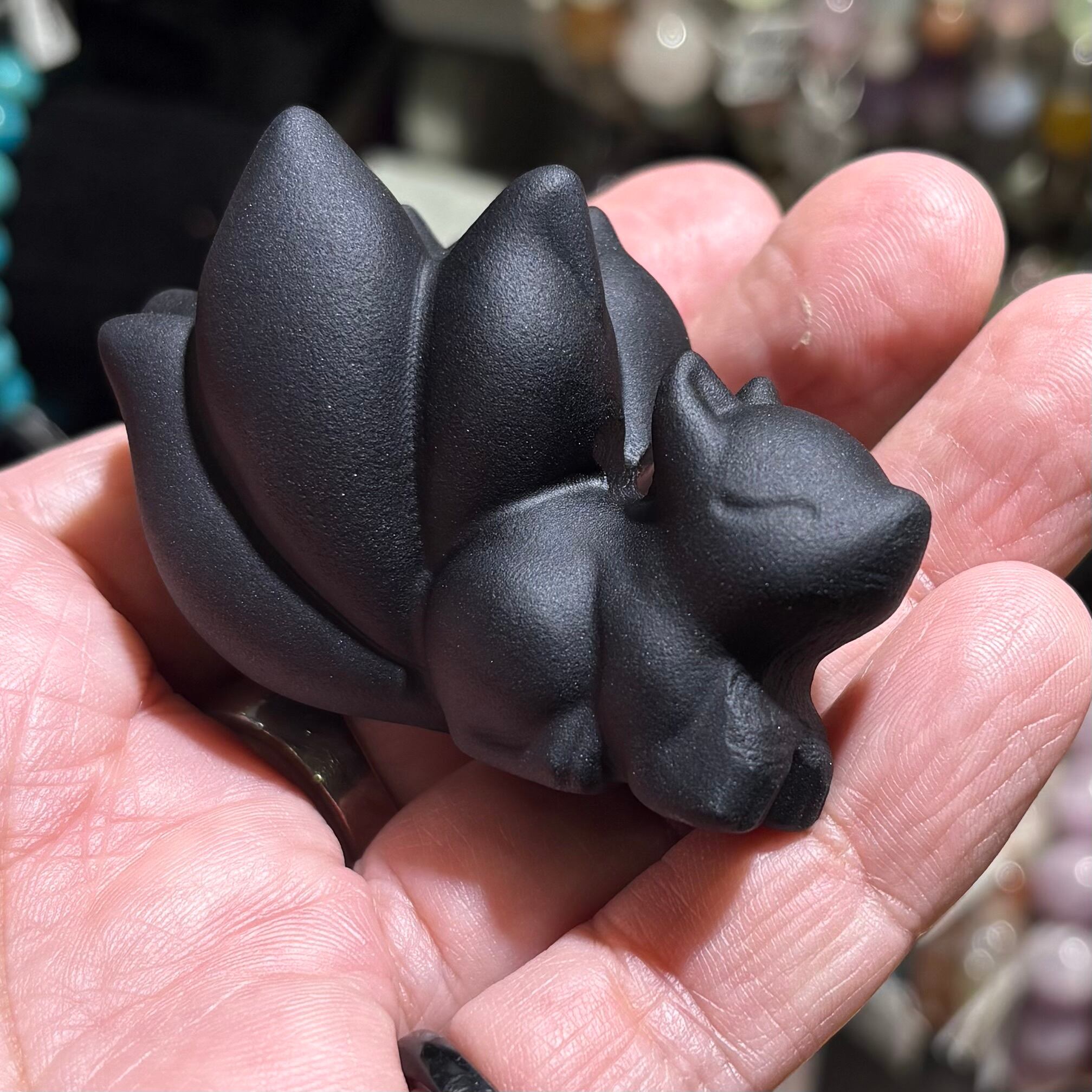 オブシディアン彫刻 九尾の狐 — 闇の中に静かに光る、艶やかな黒の造形美 —