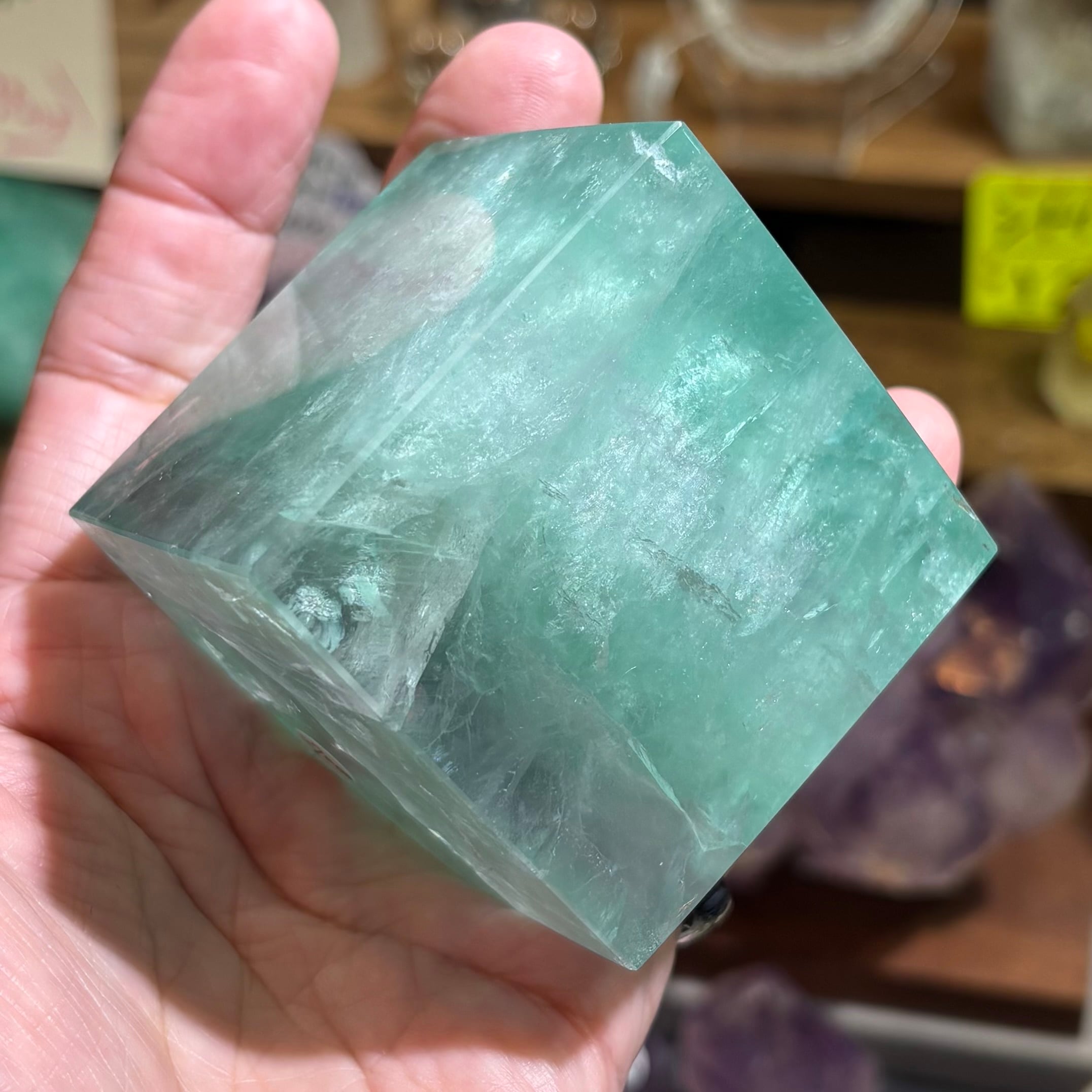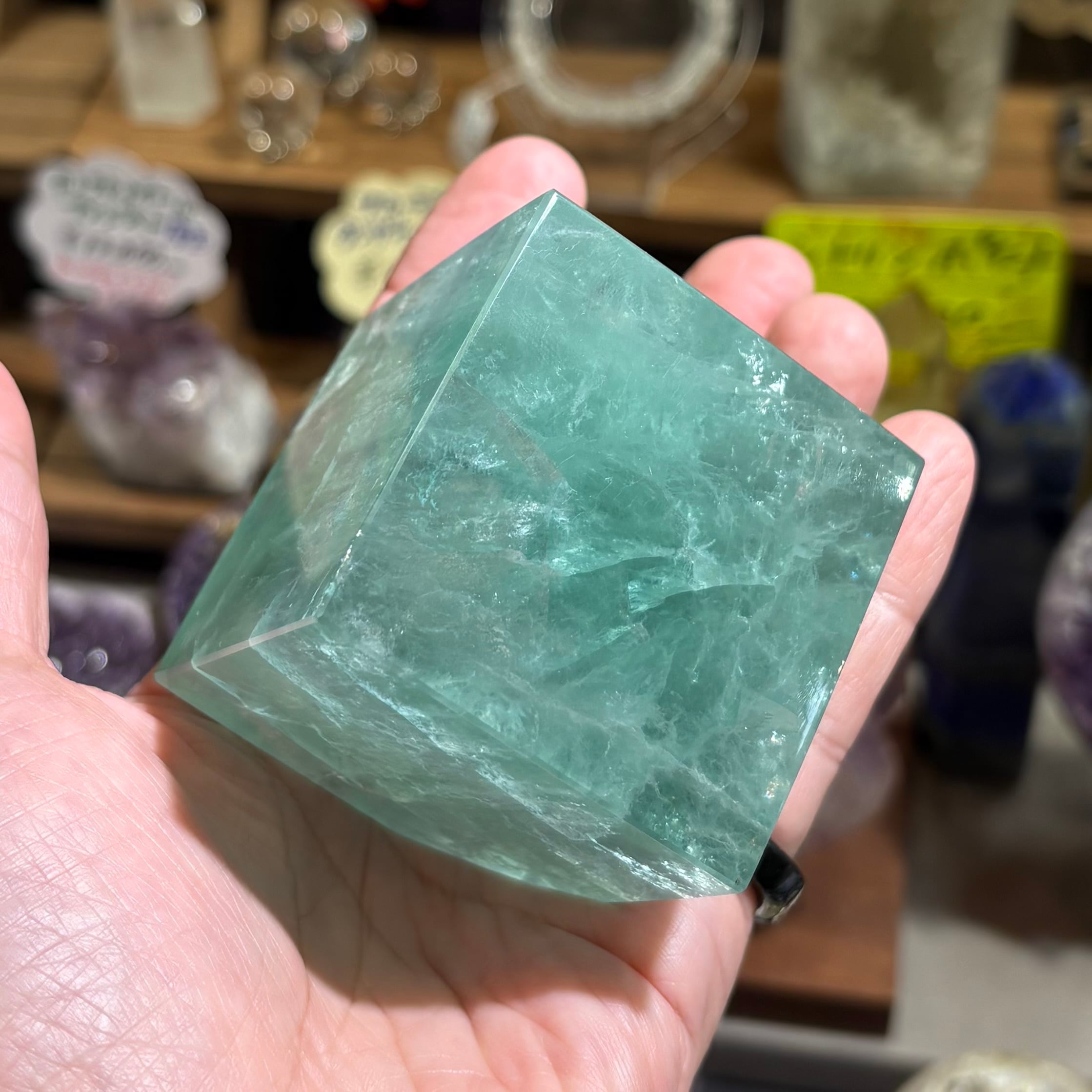 淡いグリーンが美しく透き通る、立方体結晶のフローライト磨き石です。