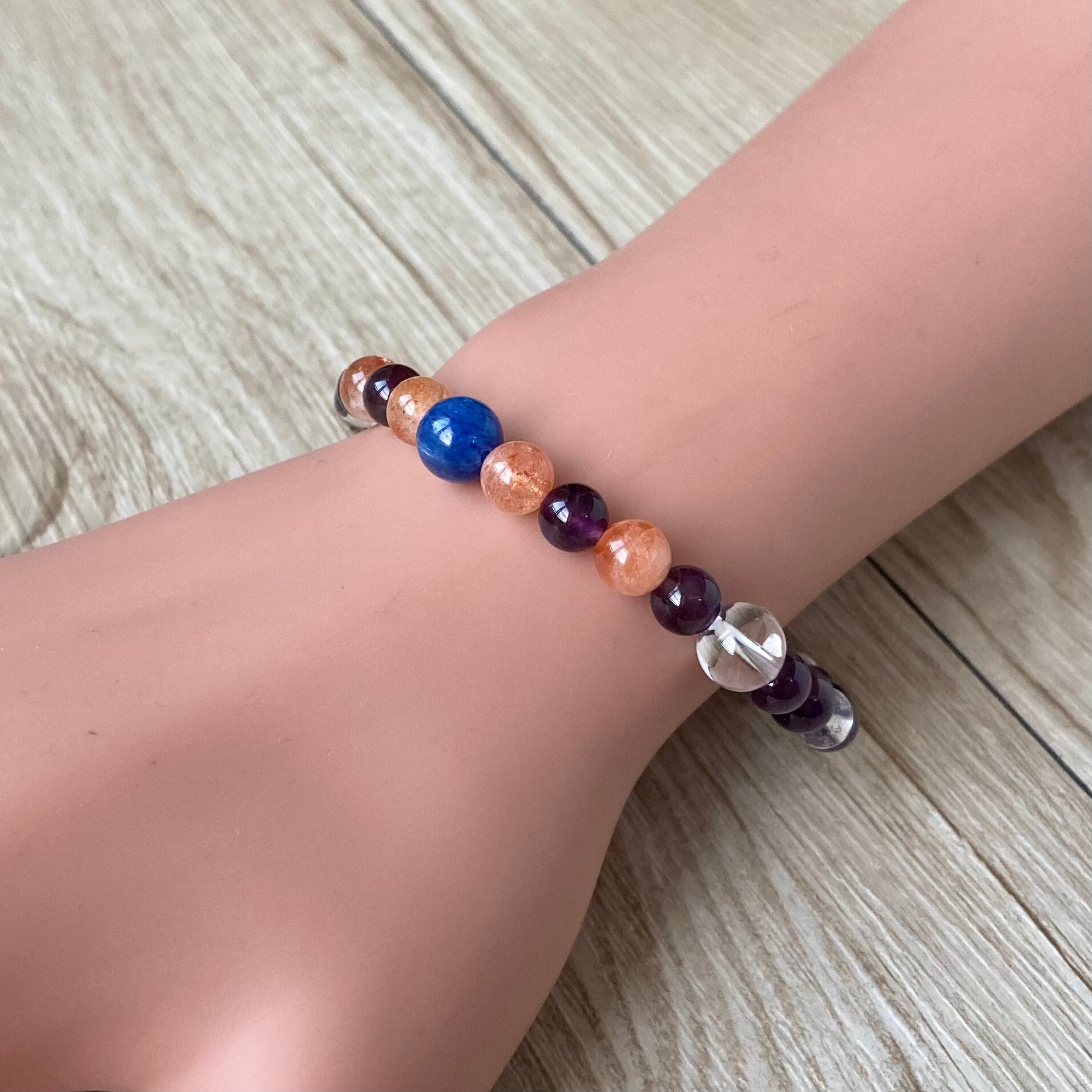 インスピレーションを高め、成功へと導く/カイヤナイト・アメジスト・サンストーン・水晶/パワーストーンブレスレット