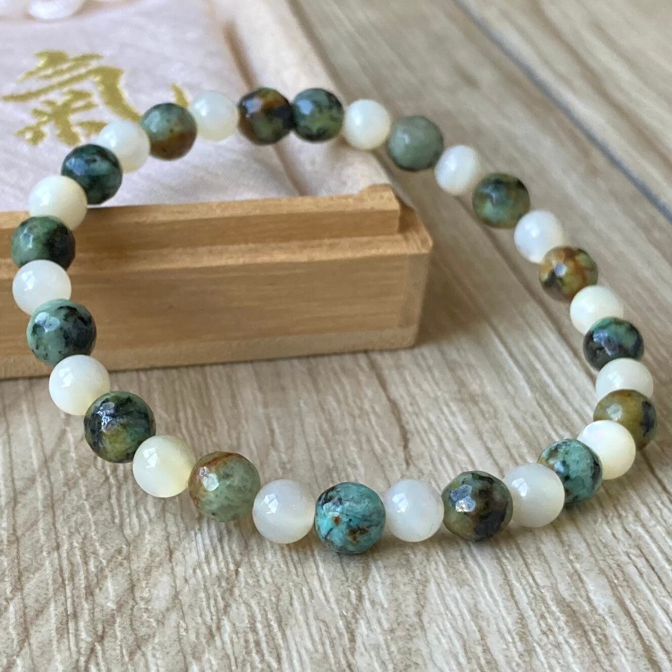 優しさで包み込み、絆を深める パワーストーンブレスレット/マザーオブパール・アフリカンターコイズ